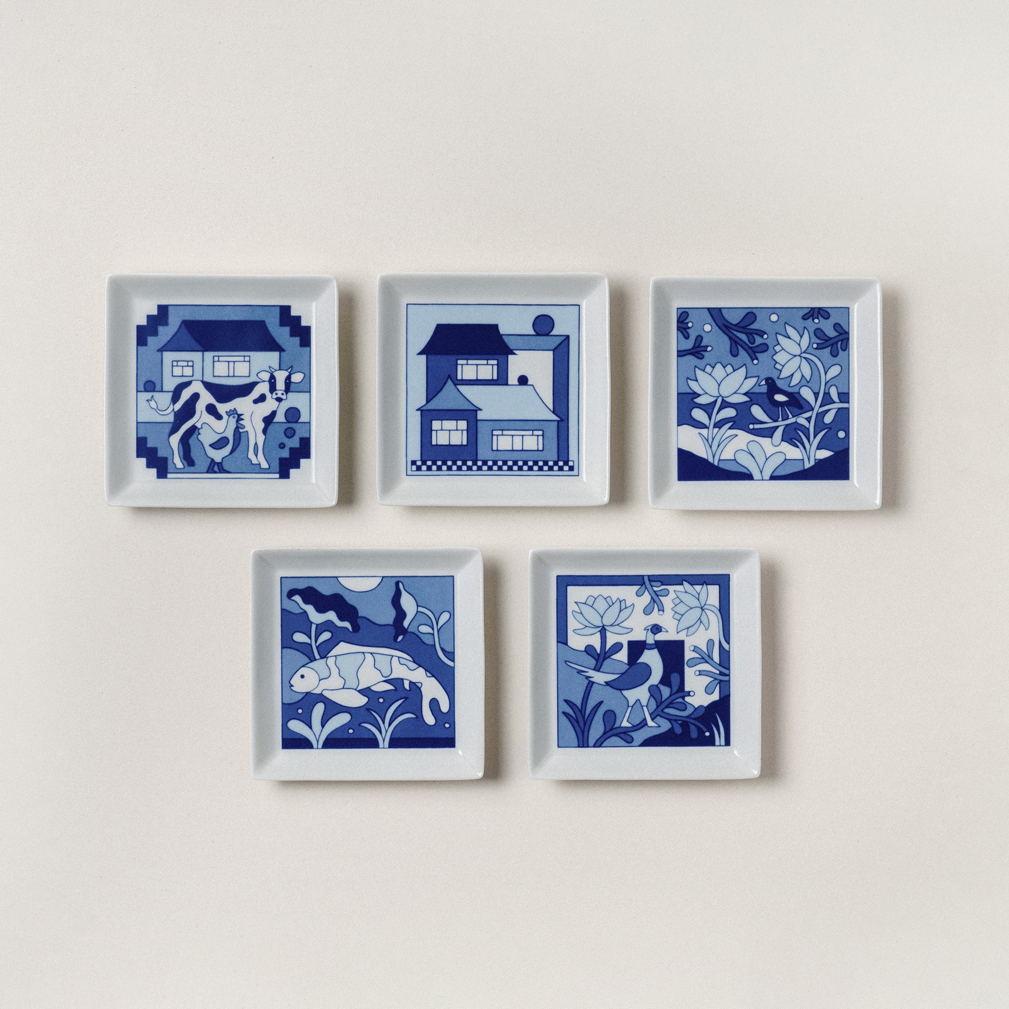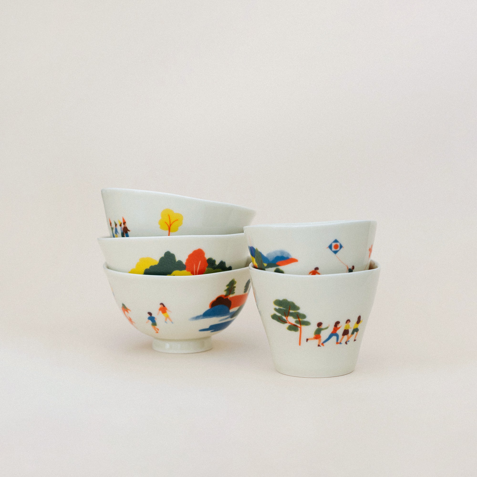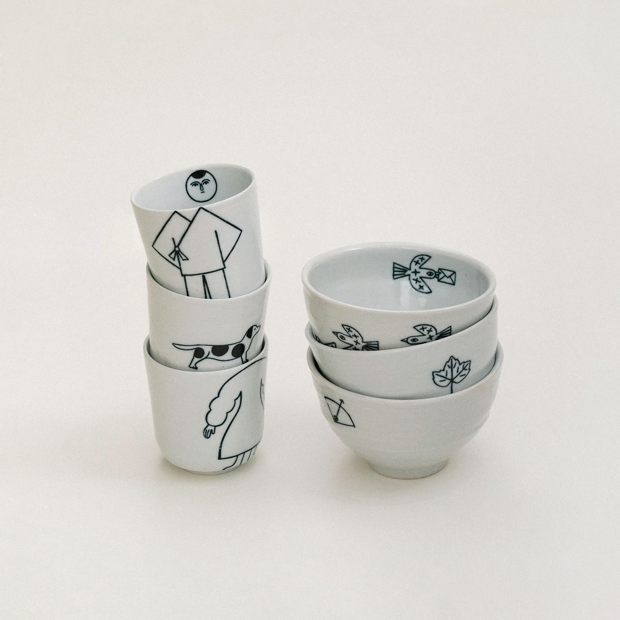 In this playful series, Amélie Fontaine explores the volumes of Ko-sometsuke porcelains, humble but full of warmth pieces whose design dates back to 1616–1650, at the very origins of Arita ceramics. Artisans decorate them using the traditional technique of rice-paper transfer before glazing, creating subtle variations in thickness and colour from one piece to the next.